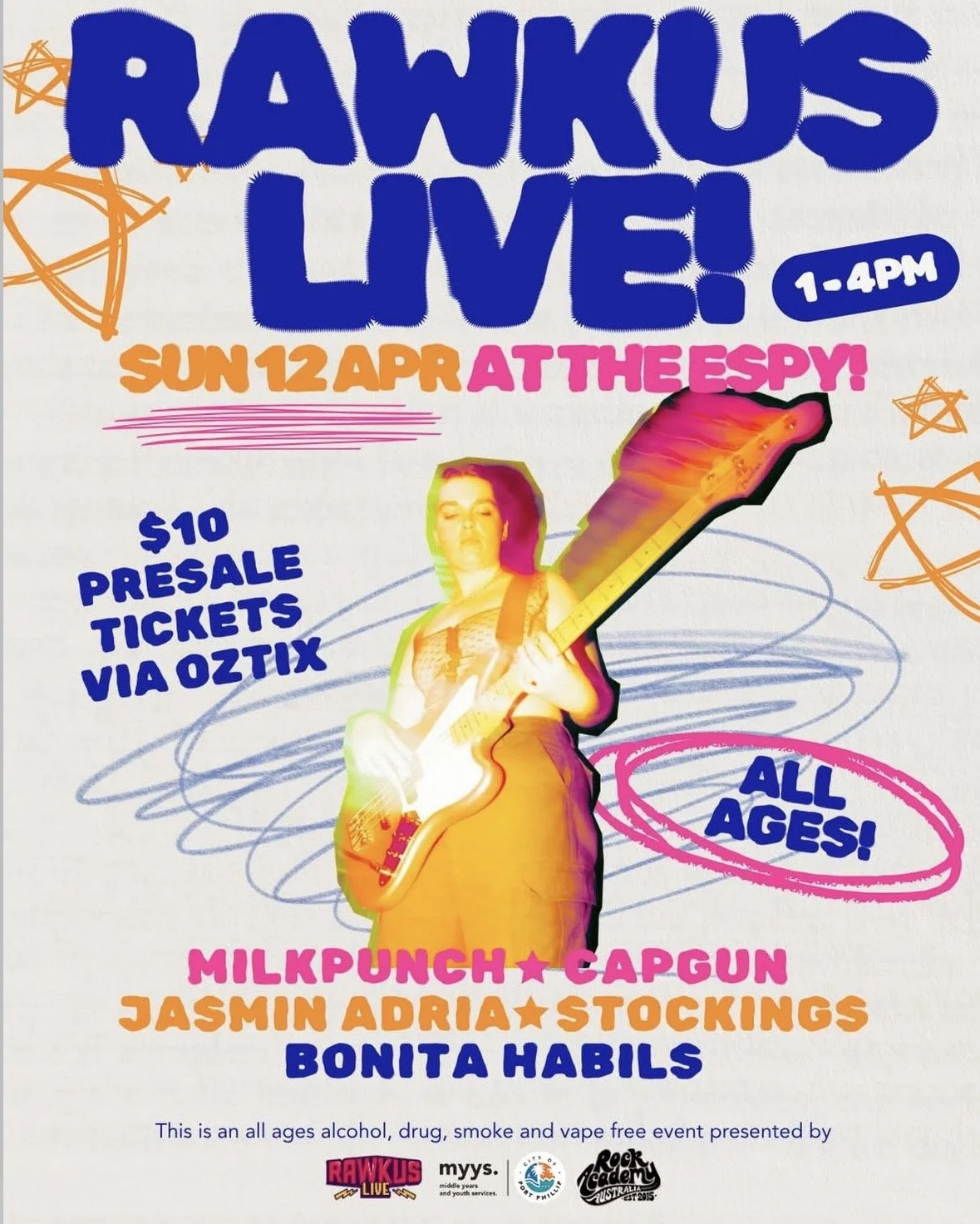 Get ready for a stunning Sunday of live music as RAWKUS Live returns to the legendary Espy Basement in St. Kilda on Sunday, April 12th, from 1 PM to 4 PM!