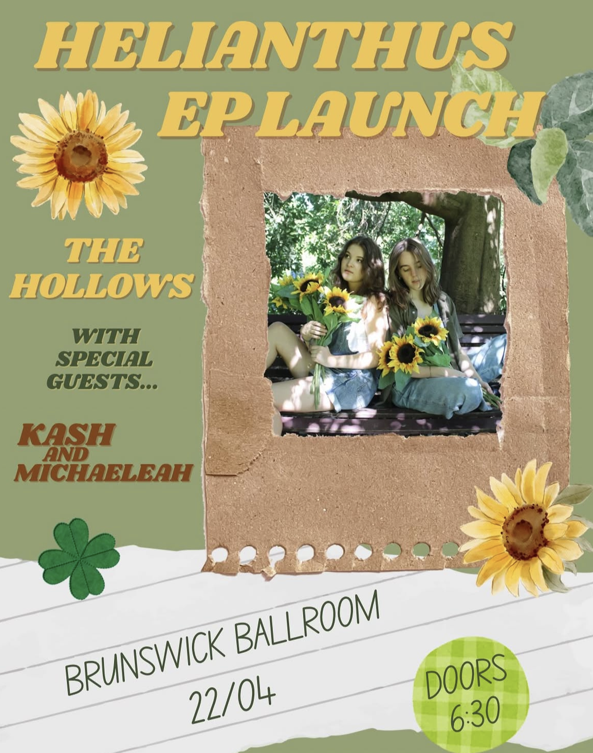 folk/indie/singer-songwriterThe Hollows are a singer/songwriter folk duo based in Melbourne, whose lyrics take center stage amongst rich acoustic soundscapes. Their poignant and raw storytelling invites listeners to a page of their diary. With combinations of guitars, pianos and delicate strings, The Hollows creates music with honesty and tenderness, valuing the feelings behind their songs. Helianthus is The Hollows’ debut EP, a project wrapped in lyrical honesty and haunting harmonies. Titled after the scientific name for ‘sunflower’, the record encapsulates the human experience of finding your identity, love, loss, and nostalgia. Through a mix of soft acoustic soundscapes and intricate melodies, each song tells a unique and emotional story. Including two previously released singles, echoes and parasite, The Hollows continue to write poignantly raw lyrics, allowing listeners to sit alongside each emotion. Helianthus is a love letter to feeling deeply throughout all walks of life, and the pain and beauty that comes from it