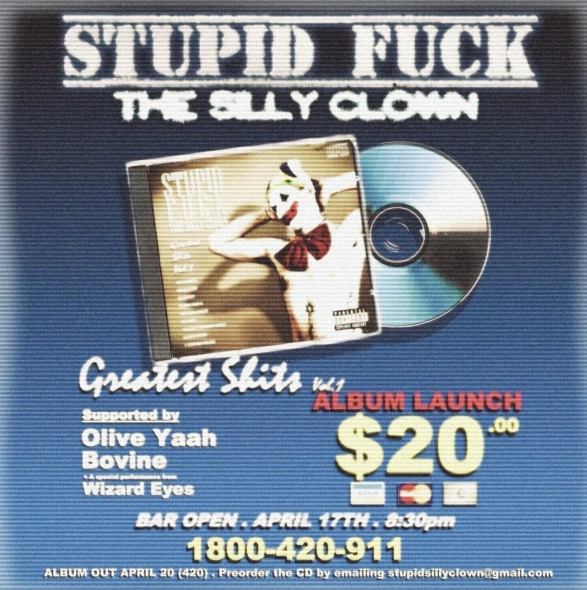 Using both a tight and talented band, and an unhinged but somehow respectful presentation of improv comedy, ridiculous skits and hilarious but groovy songs, Stupid Fuck and the Silly Clowns have consistently proven that they are not to be missed.
